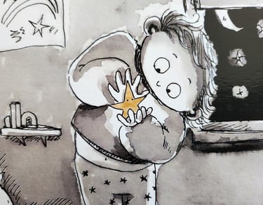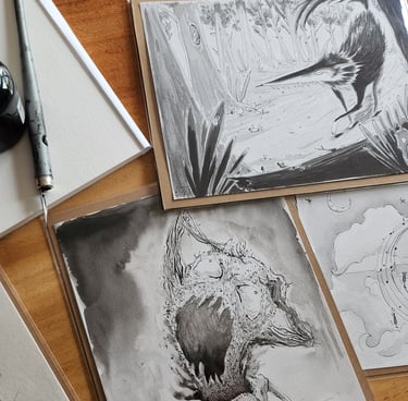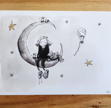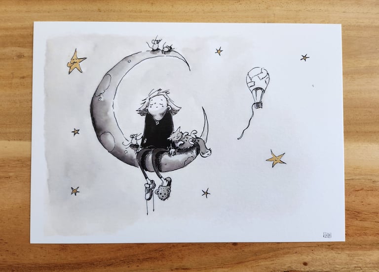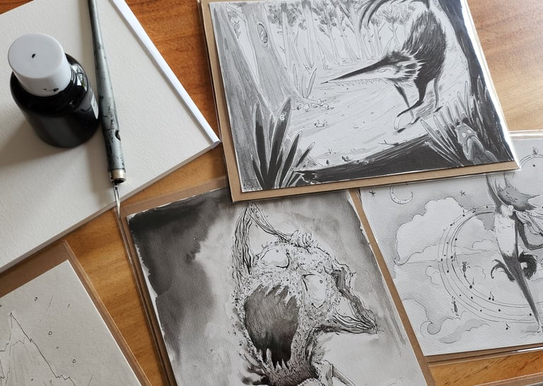 Je crée des illustrations qui, je l'espère, transportent les petits et les grands dans un voyage à la fois drôle et sombre, où le rire côtoie le mystère.